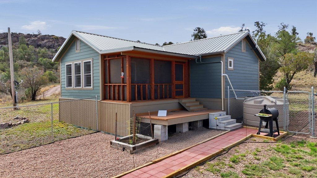 Charm meets comfort when you step into this meticulously constructed home nestled on 5 tranquil acres in the Davis Mountains! This 1 bedroom / 1 bath cottage (w/bonus room that could be a 2nd bedroom) features a stunning custom kitchen, on-demand water heater, water softener system, double pane windows, rain water catchment, pex plumbing and zoned cooling/heat. Fenced interior yard and 32x12 insulated & powered out building, a second 12x16 building and a 32 foot metal carport. Don''t miss out!