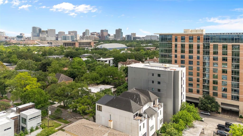 Beautifully designed 2-bed, 2.5-bath condo w/ office/study in the heart of Rice Village. Open living/dining area features oversized windows, hardwood floors & modern finishes. Sleek kitchen w/ Fisher & Paykel appliances, quartz counters, European-style cabinetry & Thermador wine fridge. Spacious balcony off the main living space offers sweeping views of Houston & Rice Stadium, perfect for entertaining or relaxing. Both bedrooms include en-suite baths & generous closets; primary suite features a large soaking tub. Ceilings range from 9-12', adding to the open, airy feel. This quiet, private unit is part of a small, access-controlled building w/ garage parking. Just steps from the heart of Rice Village, it offers unmatched walkability to some of Houston’s best dining, shopping, and coffee spots. You're minutes from Rice University and the Texas Medical Center, making it a convenient home base with a high-end, lock-and-leave feel.