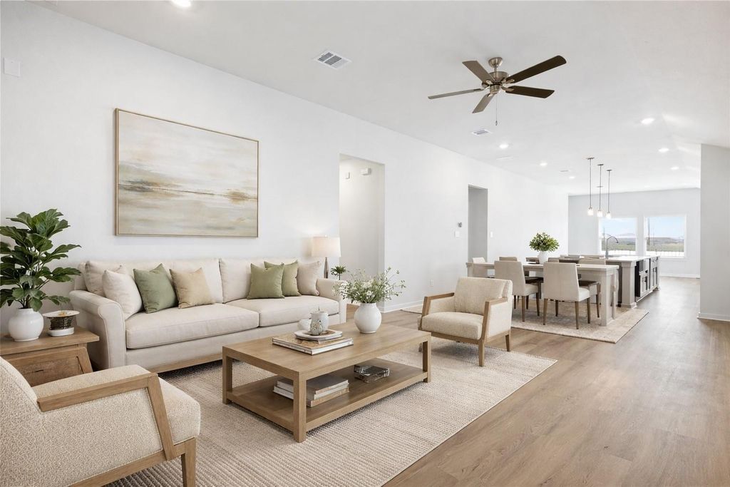 This brand-new one-story home features 4 bedrooms, 3 bathrooms, and a 2-car garage, with a modern open-concept design and 9-ft ceilings. The interior includes wide-format tile flooring, plush carpet, and a luxurious Mahogany front door; the kitchen is equipped with wood shelving, and the living room and primary bedroom have ceiling fans. The exterior offers a brick front with stone accents, a fully finished yard, a private wood fence, a backyard patio, and a garage door opener. Contact us to schedule a showing!