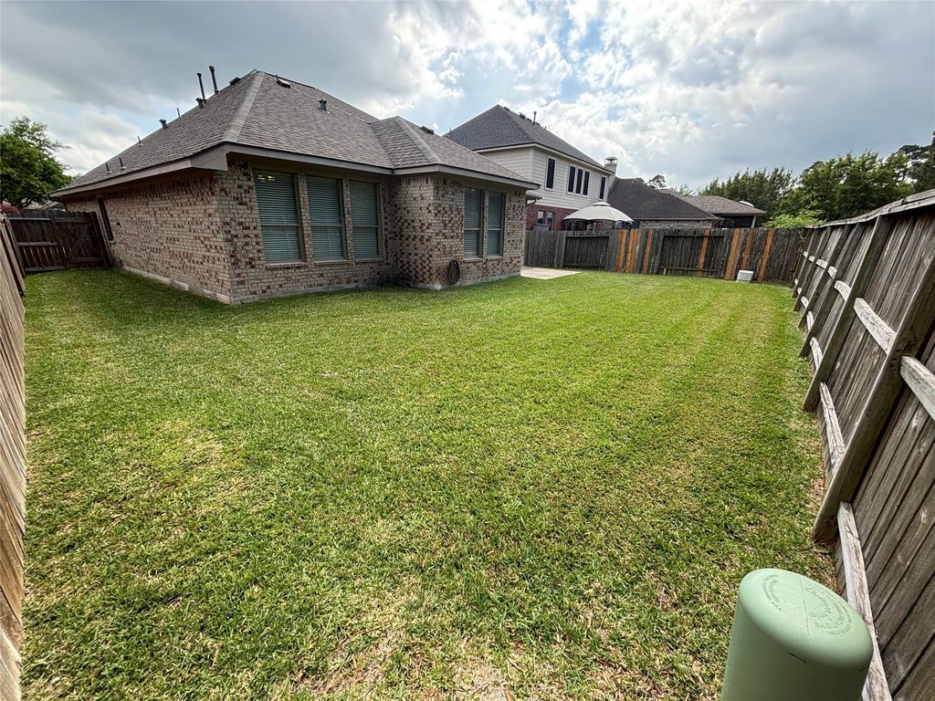 Located in Kings Manor, this beautiful single story brick and stone elevation home has an open floor plan with a large kitchen opening to the dining, breakfast, and living room areas all wrapped in crown molding. 10' ceilings in main house area and 9' ceiling in the bedrooms. Two secondary bedrooms and a full bathroom in the front of the home and the primary bedroom is located at the back of the home. There is engineered wood and tile throughout the majority of the home. The new roof was just installed this year. The kitchen has stainless steel appliances, under cabinet lights, and custom pull outs in the cabinet door locations. There are also storage shelves in the garage. This location is just minutes from highway 59 with easy access to surrounding area and amenities.