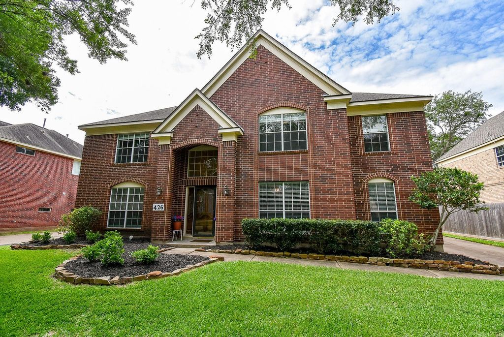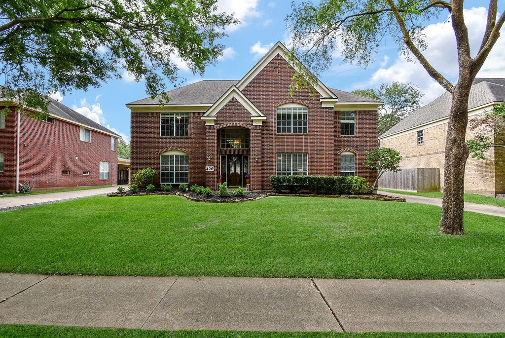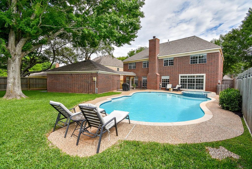 Are you looking for a 5 bedroom, all-brick, updated two-story home with a pool and spa zoned to Elkins High School? Would you like quick access to Highway 6, the new Lifetime Fitness, Starbucks, and restaurants? If so, 426 Oyster Creek Village checks all your boxes. Other benefits include a quiet tree-lined street, no back residential neighbors, and an EV charging plug in the garage. Two remodeled full baths and a gameroom upstairs. Spacious primary with ensuite and a powder bath downstairs. Two primary closets. Luxury vinyl plank flooring throughout downstairs. Kitchen boasts a 8-burner gas cooktop, stainless steel appliances, including an oven with a warming drawer. Two pantries, one walk-in. Utility room has space for a second fridge. The sparkling pool is the gem of the home - recently replastered and spa tile updated. Please use the virtual tour link for a walk-through video.
