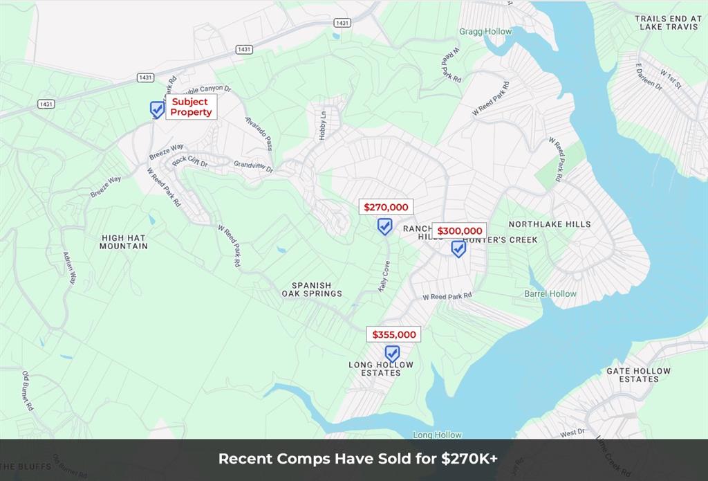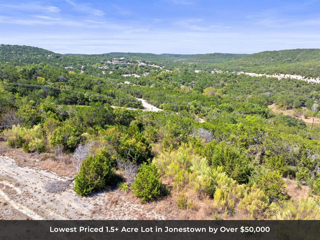 Check out the amazing value on this beautiful building lot! This is the lowest priced 1.5+ acre lot on the market in all of Jonestown by over $50,000. The lot offers gorgeous Hill Country views and multiple great building spots. There are also no deed restrictions or HOA to limit what you can build on the property. You can make this lot your own blank canvas to design and build the home of your dreams. It is nestled among numerous beautiful trees for added peace and privacy and is approximately 200 ft wide and over 450 ft deep. The partial dirt driveway is about in the center of the lot, so there is about 100 ft of street frontage on each side of the driveway. Feel free to walk the lot anytime, and if you're uncertain about the property lines, please reach out to the listing agent for more info. It is eligible for a 5% down construction loan for qualified buyers. Don't miss out on this one. This is a fantastic value, and there is also a 2.07 acre lot right next to this one that is also available to purchase. The lot has electric and water available at the street, but a septic system will be required.