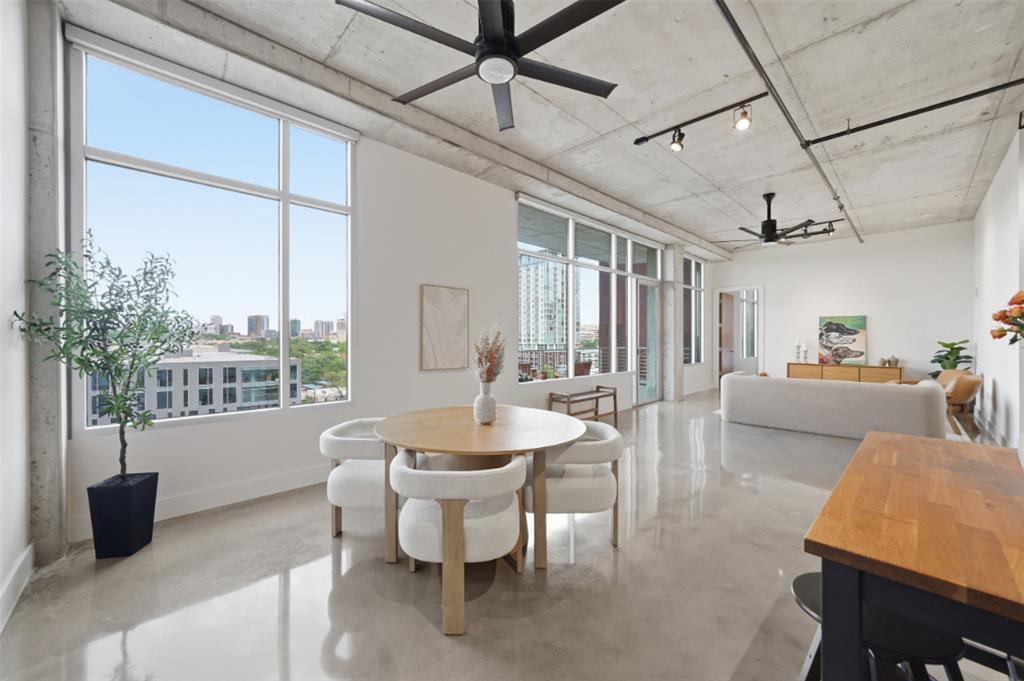 Perched high above downtown in the iconic Austin City Lofts, this sleek north-facing residence offers sophisticated urban living with expansive city views and a bright, open layout. Notably larger than many comparable downtown condos, the home offers an impressive sense of scale rarely found in urban loft living. Oversized windows fill the space with natural light while polished concrete floors, soaring 11' ceilings, and exposed architectural elements create the signature modern loft aesthetic. The open-concept living and dining areas flow seamlessly to a spacious private balcony, providing the perfect setting for morning coffee or evening relaxation overlooking the city skyline. The well-appointed kitchen features a center island, granite countertops, Thermador gas range + dishwasher, stainless steel refrigerator, generous cabinetry, and a functional layout ideal for everyday living or entertaining, with all appliances conveying. The spacious bedroom offers a quiet retreat with large windows and an oversized walk-in closet featuring a California Closet system for exceptional organization. The bathroom includes granite countertops, ample storage, and a full tub/shower combination. Additional highlights include a generous pantry + separate, dedicated coat closet, one reserved parking space and a thoughtfully designed floor plan that maximizes both light and space. Residents of Austin City Lofts enjoy outstanding amenities including a pool, hot tub, grilling area, and picnic spaces, along with full-time on-site management and 24/7 concierge service. Located in one of downtown Austin’s most walkable areas, this home places you just steps from Whole Foods, Trader Joe’s, the Central Library, Seaholm District, Lady Bird Lake, the Hike & Bike Trail, and countless dining, entertainment, and shopping options. This is downtown loft living at its finest—modern, convenient, and effortlessly stylish. Schedule a showing today!