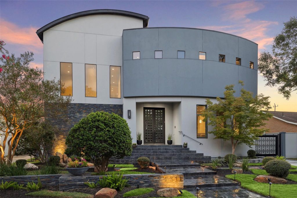 Welcome to 5311 Queensloch Dr, a stunning contemporary home in Meyerland, designed for luxurious living & entertaining. An abundance of windows fills the home w/ natural light, while sleek, high-end finishes enhance the inviting atmosphere. A sweeping curved staircase elegantly separates the living room from the dining room, which features a soaring 22-foot ceiling & a dramatic wall of windows. Living area boasts a full wet bar, great for hosting gatherings. Kitchen is equipped w/ high-end appliances & offers a lovely view of the pool, while a relaxing den is conveniently located nearby, along w/ a stylish home office. Upstairs, you'll find 3 stylish secondary bedrooms, a game room w/ wet bar adjacent to a spacious media room. Primary suite is a tranquil oasis, with a spa-like bath, 2 closets & stunning shower. Take the elevator to the 3rd floor, an ideal space for storage. Outside, enjoy 2 patios, outdoor kitchen, pool w/ soothing water feature & fire pits. Zoned to Kolter Elementary!