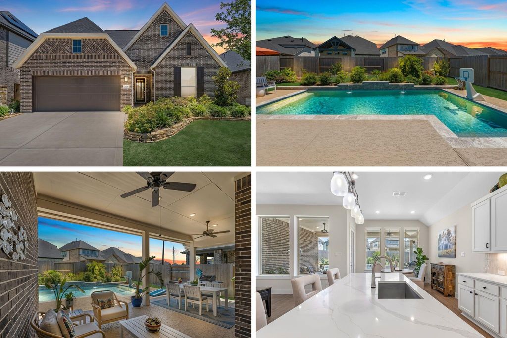 Live the resort lifestyle every day in this STUNNING 1-story home, beautifully designed with a timeless brick elevation and elevated, neutral finishes. This 3–4 bedroom, 2.5 bath gem offers an open, light-filled layout, wood-plank tile floors, soaring ceilings, and 8-ft doors. Two spacious secondary bedrooms plus a large flex room provide space for media, hobbies, or a 4th bedroom. The bright family room showcases views of your private backyard oasis with PebbleTec pool and extended covered patio—ideal for entertaining or relaxing. The gourmet kitchen features quartz counters, crisp white cabinetry, and a sunny breakfast nook. The primary suite offers a spa-inspired shower, dual sinks, and elegant Grey Wolf cabinetry. Added perks include a K5 water softener system, plus community fitness center, lakes, trails, and amenity center within walking/biking distance. Zoned to A-Rated Leaman JH + Fulshear HS and priced to sell! Get into your dream home with its dreamy pool before the holid