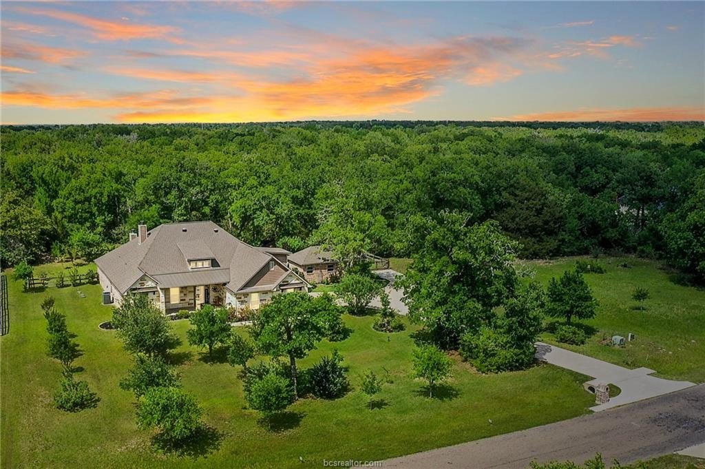Luxury meets country living on 1.18 acres in King Oaks - and this one checks all the boxes! Custom luxury home, gorgeous enclosed patio, sparkling blue pool, covered outdoor space for entertaining, and a separate brick shop building (406 sq.ft.). Inside the showstopper is the grand open-concept living area with soaring vaulted ceilings, stained pine accents, and a floor-to-ceiling stone wood-burning fireplace with a custom cedar mantle. The kitchen is designed to impress with a large granite island, abundant cabinetry, gas cooktop, double oven, dishwasher, and drawer microwave, while the dining area features a striking exposed brick wall. The flexible floor plan includes four bedrooms, 3.5 baths, a dedicated office with a spacious closet, and an upstairs bonus space ideal for a guest suite, gym, or media room. The primary suite offers a quiet retreat with windows overlooking the pool, plus a spa-like bath with dual vanities, soaking tub, zero-entry shower, and built-ins. Step outside to a huge screened patio with fireplace, a sparkling in-ground pool, and expansive entertaining areas. The tree-filled lot also offers a cleared space ready for raised bed gardens. Even the laundry room delivers with a built-in dog kennel!. King Oaks where the setting is peaceful, the amenities are exceptional, and still just 20 minutes to Bryan-College Station and Texas A&M University. The 1.18 lot beside this property is also listed for sale and can be purchased with this property.