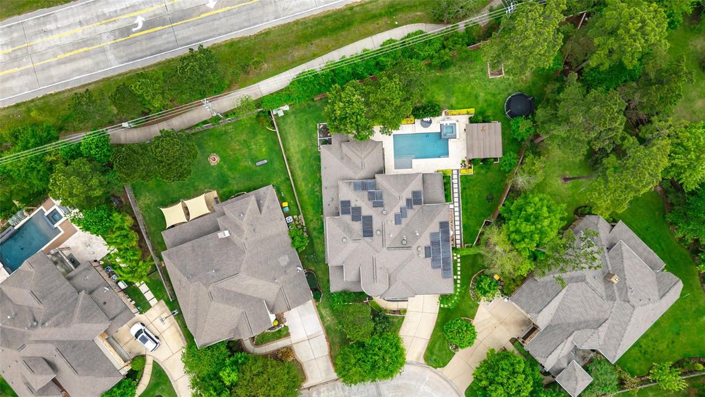 Classic elegance meets Mediterranean style in this stunning property in Creekside Park, The Woodlands Texas! Amazing backyard with spacious covered patio, travertine floors, pebble pool and jacuzzi, handcrafted pergola, half bathroom and outdoor shower. Open floorplan downstairs, living room with high ceilings, gourmet kitchen with modern style cabinetry, butler's bar, formal dining, office with wood beams, guest bedroom with full bathroom, half bathroom and a stunning spiral staircase. Engineered wood floors and travertine tile throughout, carpet only in the media room. Upstairs are three bedrooms, two share a Jack and Jill bathroom, a second full bath serves the 3rd room, the gameroom and media room. High end light fixtures and ceiling fans. The solar panels are paid off, tankless water heater and extra racks in the garage. Carefully maintained landscaping with mature trees, schrubs and lawn. This property has it all!