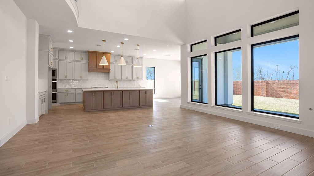Private courtyard. Front porch leads to welcoming two-story entry with 20-ft ceilings framed by a home office with French doors and a circular staircase. Two-story family room with soaring 21-ft ceiling features a wood mantel fireplace and a wall of windows. Island kitchen with built-in seating space offers a generous walk-in pantry, a double wall oven, 6-burner gas range top and a spice kitchen that leads to the formal dining room. Morning area with a curved wall of windows just off the kitchen. Private primary suite with a curved wall of windows. Primary bath features a French door entry, dual vanities, freestanding tub, separate glass enclosed shower, linen closet and two walk-in closets. Guest suite with a full bathroom and walk-in closet downstairs. Second floor features additional guest suites with full bathrooms, a game room with a wall of windows and a media room. Utility room offers dual access to the primary bathroom. Covered backyard patio. Mud room. Three-car split garage.