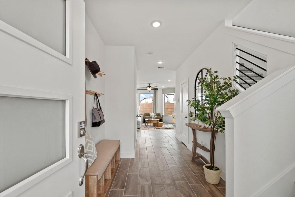 Beautiful two-story home featuring three bedrooms, 2.5 baths, and a spacious game room, with all bedrooms located upstairs. This home welcomes you with a stunning two-story foyer and an abundance of natural light throughout. The first floor offers wood-tile flooring, a cozy fireplace, and an open-concept living space perfect for entertaining. The kitchen boasts quartz countertops, walk-in pantry, and modern finishes. All appliances are included, stainless steel refrigerator, washer, and dryer. Enjoy added convenience with a sprinkler system, alarm system, 2-inch blinds throughout, and a two-car garage. The upstairs game room opens to a private outdoor balcony, perfect for relaxing. Designed with energy-efficient features for comfort and savings, this home blends style, function, and modern living in the beautiful Master Planned Community of Sienna. **Home is under construction - Est. completion March 2026 - photos are representative**