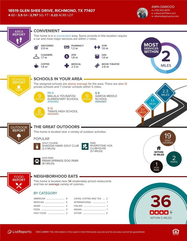 18519 Glen Shee Drive is listed for sale at $ 514,900. The Single-Family property has 4 bedrooms, 3 Full Bathrooms, 1 Half Bathroom, 2797 square feet and was built in 2019. The lot size is 10122 Square feet. ##BR##Beautiful 2019 Lennar home in the highly sought-after Aliana community offering 2,797 sq ft of well-designed living space. This move-in ready home features 4 bedrooms, 3.5 baths, and an open-concept layout that seamlessly connects the kitchen, dining, and family room, perfect for everyday living and entertaining. The first-floor primary suite includes a soaking tub, separate shower, and a private retreat feel. Upstairs offers three additional bedrooms and a spacious game room. Enjoy granite countertops, high ceilings, Energy Star appliances, a gas fireplace, and a programmable thermostat for comfort and efficiency. Step outside to a covered patio overlooking a fully fenced oversized 10,122 sq ft backyard with mature landscaping and sprinkler system. Located in Aliana with access to resort-style pools, tennis courts, fitness center, trails, and parks. Zoned to top-rated Fort Bend ISD schools with easy access to Grand Parkway, Westpark Tollway, and nearby shopping and dining.