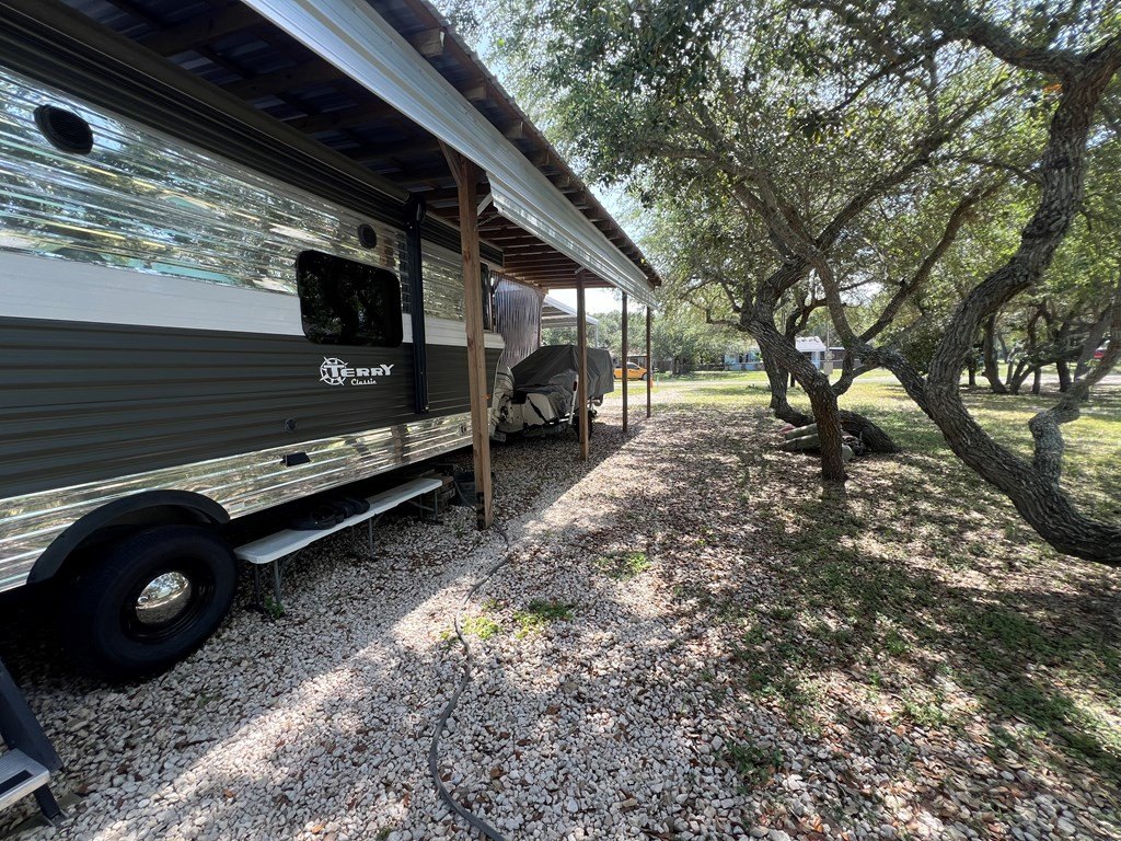 Pull in and start relaxing- this 32'' x 128'' lot is already set up with a covered RV carport and city water and sewer! Located in the county where RVs and mobile homes are allowed, this property is shaded by pretty trees and makes the perfect full-time spot or weekend escape. The teal storage building in the back of the property is climate controlled- can be used for extra living space, office, or storage! Even better, you can also purchase the adjacent lot at 724 N Kossuth to double your space to 64'' of frontage! Room for extra parking, a second RV, or just more elbow room to enjoy life by the beach. Set up and stay awhile- Rockport is waiting!