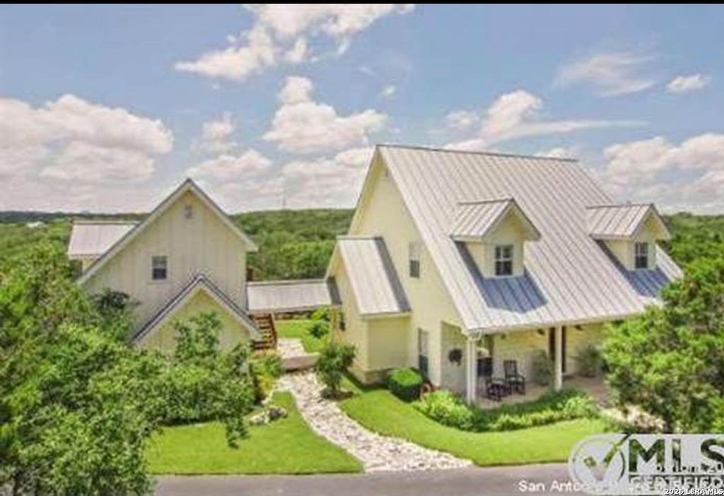 Discover this rare nearly 4-acre private estate in the exclusive, guard-gated community of Sendero Ranch. Tucked away on a fully fenced lot with mature trees, beautiful landscaping, and a serene walking path, this custom home offers unmatched privacy and Hill Country charm. Inside, enjoy luxurious hardwood floors, custom shutters and built-ins, oversized bedrooms, abundant storage, and exceptional quality construction throughout. A standout metal roof and solar panels add modern efficiency and style. Relax in the sunroom overlooking the spacious deck and lush backyard-perfect for taking in the peaceful natural surroundings. Practical luxury continues with a carport, 3-car garage, and ample paved parking areas, making it easy to accommodate multiple vehicles or guests. As a plus, the charming garage apartment provides flexible living space for visitors, in-laws, or extra income potential. This home and neighborhood offers the best of both worlds: tranquil Hill Country living just min