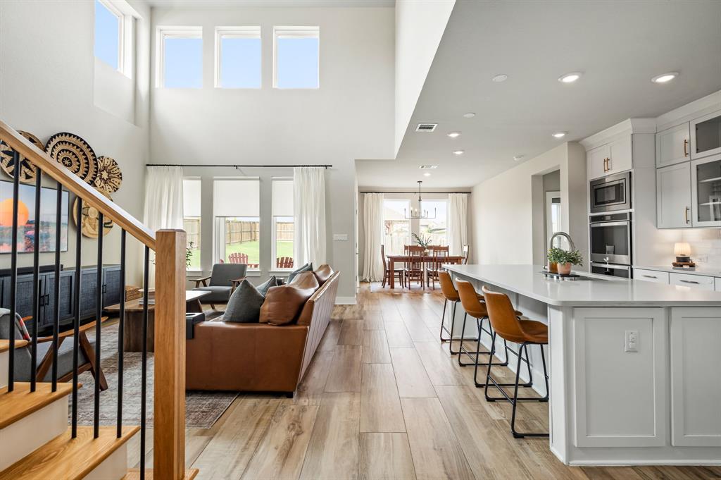 Main Floor; Kitchn - Breakfast Area, Breakfast Bar, Center Island, Quartz Counters, Eat In Kitchen, High Ceilings, Open to Family Room, Pantry, Recessed Lighting; SS appliances; Double ovens; Gas cooktop; Display cabinets