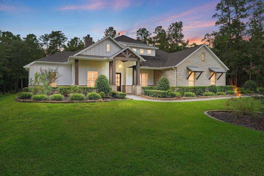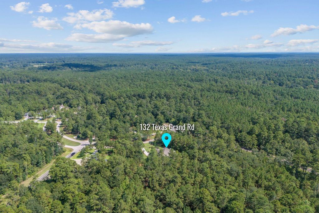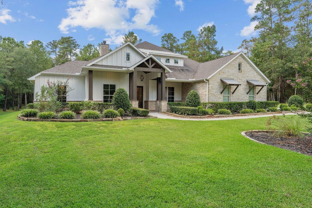 Rvision Model Home backed to the National Forest located in the highly desirable acreage community in Texas Grand Ranch! You enter this stunning one story through double wood front doors, home study on the left w/brick accent wall, tray ceiling & French doors. To the right of entry is a large formal dining with brick wall & built-shelves & tray ceiling. Butlers pantry w/sink, and wine/beverage area w/fridge. Vaulted living room with wood beams, & fireplace that sets the stage w/brick to the ceiling. Kitchen & breakfast area open to living area for great entertainment spaces. Kitchen features double oven, drawer/microwave, leathered granite countertops, large island, 5 burner gas cooktop & walk-in pantry. Engineered wood floors through main living areas, carpet in bedrooms & game room. Large game room w/ 1/2 bath and doors out to back patio. Step out to your backyard oasis, stamped concrete patio, outdoor kitchen & your own private forest! 3 car garage w/epoxy floors. NO MUD, LOW TAXES!