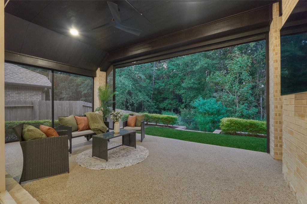 Gorgeous ONE STORY home! Extended entry and 12ft coffered ceilings lead into this beautiful home leveraging warm natural woods and the sophisticated contrast of black accents w/white elements that create a balance of cozy and contemporary. 4 beds, 3 FULL baths, and HOME OFFICE, large primary w/ELECTRIC SHADES, primary closet walks through to laundry, a PRIVATE GUEST SUITE w/full bath AND walk-in closet, 2 add'l beds w/walk-in closets, and an add'l full bath round out the brilliant design of this home. Beautiful OPEN CONCEPT kitchen/dining/living w/modern full-height white cabinets, uppers featuring glass doors and lighting, oversized island, extended counters, large dining space, and floor to ceiling stone fireplace complete the space. The MOTORIZED SCREENED-IN BACK PORCH/EXTENDED PATIO, along with STACKING SLIDING GLASS DOORS extend your living space outside. NO BACK NEIGHBORS allow for ULTIMATE PRIVACY. Invisible fence, washer, dryer, and fridge stay! Come call Woodforest home today!