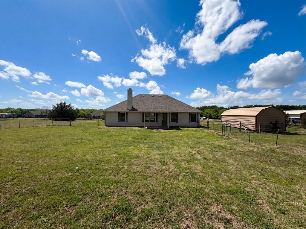 Experience peaceful country living just minutes from shopping and I-30 in this charming single-story ranch situated on 1.5 acres—one acre fully fenced—with no HOA and located outside city limits. Beautifully maintained, the home features a new roof installed in April 2023 and showcases custom finishes throughout. The thoughtfully designed split floor plan offers 3 bedrooms and 2 bathrooms, highlighted by engineered bamboo flooring, decorative chandeliers, and a cozy wood-burning fireplace anchoring the open living space. The kitchen is a standout with granite countertops, travertine tile flooring and backsplash, a copper sink, bar seating for four, ample pantry storage. The private primary suite includes a unique antique vanity with a copper sink and a spacious walk-in shower. Step outside to enjoy a fully fenced backyard, extended rear patio, and a 12x24 storage shed—perfect for tools or hobbies. Additional features include extra attic decking above the garage, fast fiber broadband, a circular driveway with abundant parking, wood blinds, and ceiling fans in every room