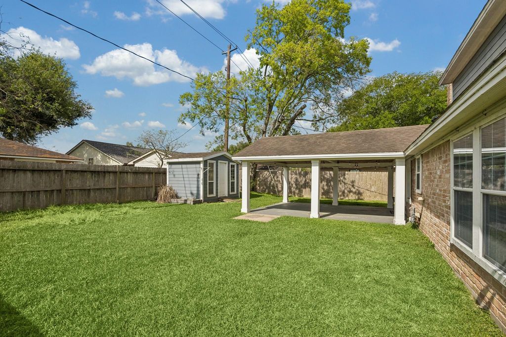 9826 Carlow Ln. is a 1,925 S/F, 4 bedroom 2.5 bath home located in La Porte's Fairmont Park West. Lower level primary has dbl windows overlooking the backyard, recessed lighting & en-suite bath w/wood-look tile floor, updated oversize shower w/tile surround & frameless glass enclosure, granite topped vanity w/double undermount sinks w/S/S finish fixtures & W/I closet. Kitchen features: slab granite counter tops w/granite tile backsplash, 42" cabinets, travertine floor, 5-burner gas range w/convection oven & recessed lighting. Dining area has large window overlooking the front yard and has a vaulted ceiling and is open to the kitchen. Family room has tile floor and access to backyard with covered concrete surface patio. Large workshop/storage building is included. 1/2 bath down w/updated vanity. Full bath 2 is up with tile floor, tub/shower combo & updated vanity. B/R 2 has B/I shelving & drawer storage. B/R 3 has B/I entertainment center, drawer storage & W/I closet. Updated windows.