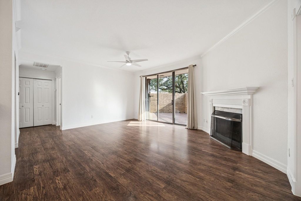 Imagine living poolside at a very quiet pool that feels like its all yours! This is the case with unit #A101. Spacious first floor unit with an updated kitchen and gorgeous designer bathroom. Large living room with patio views and a wood burning fireplace. Dining room is open to the living room and has a pass through to the kitchen. Kitchen has lots of storage, beautiful wood cabinetry and granite counters. Full sized washer & dryer with storage. Spacious primary bedroom with walk-in closet and patio views. Beautifully updated bathroom with rain shower and designer finishes. Huge patio with antique faux fireplace. The unit has a 2 yr old water heater and 2020 HVAC. The complex has a brand new roof (October 2025), resurfaced pool (Summer 2025) and new pool furniture. Walk 2 blocks away to grocery store, restaurants, shopping and a new Barnes & Noble!