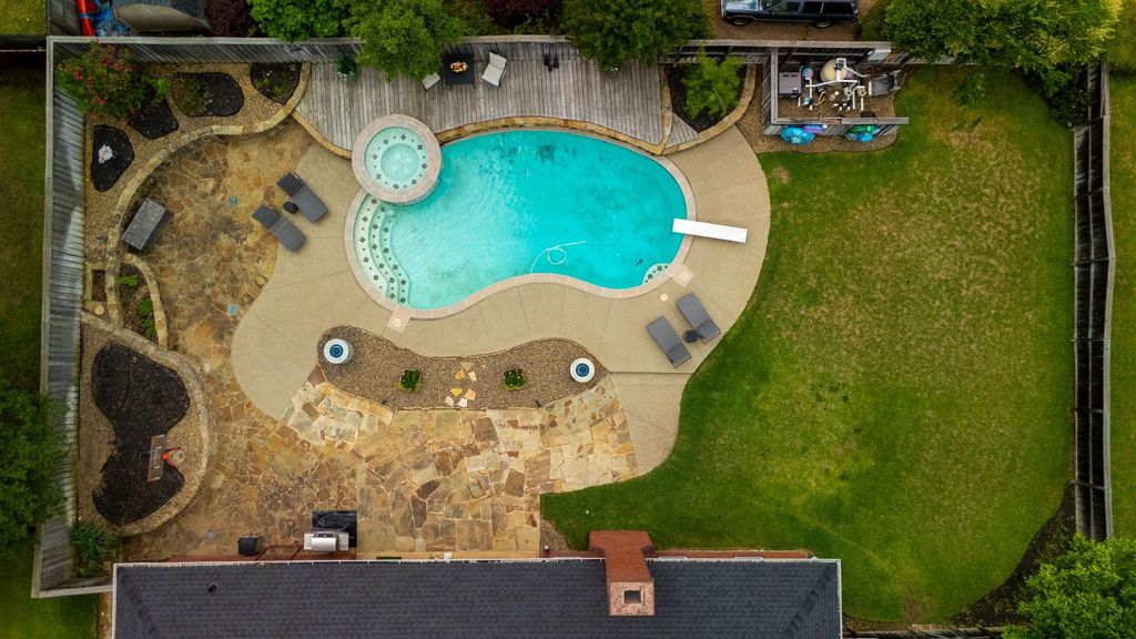 Welcome to this stately and thoughtfully designed home at 5701 Churchill in Tyler, offering a unique layout that truly centers around everyday living. Featuring 3 bedrooms, 2 bathrooms, and two expansive living areas, this home blends functionality with charm in all the right ways. A circular driveway and side-entry garage create an inviting first impression, leading into a spacious foyer filled with natural light. Just off the entry, you’ll find a formal dining room and a bright front living area surrounded by windows, creating a warm and welcoming space. At the heart of the home is the recently updated kitchen, designed to be the true hub for gathering. It features painted cabinetry, a stylish wainscoting accent wall, and a large breakfast nook with a bay window overlooking the backyard. The kitchen’s central location seamlessly connects both living areas, making it ideal for entertaining and everyday life. Privately situated off the kitchen, the primary suite offers a comfortable retreat with an ensuite bathroom complete with double lavatories, separate shower and tub, and dual walk-in closets. Nearby, a convenient half bath adds extra functionality for guests. On the opposite side of the home, the cozy family room features a wood-burning fireplace, built-in shelving, and a charming alcove perfect for a home office or study space. Two additional bedrooms and a full bathroom are also located in this wing, providing a well-balanced split floor plan. Additional highlights include a large laundry room and a mud bench with storage just inside the garage entry. Step outside to enjoy the true showstopper: a beautifully designed backyard oasis. Tiered landscaping and expansive decking surround a sparkling pool and hot tub, creating the perfect space for relaxation or entertaining. There’s even plenty of yard left for a trampoline, playset, or outdoor activities. This home offers space, character, and a layout designed for both