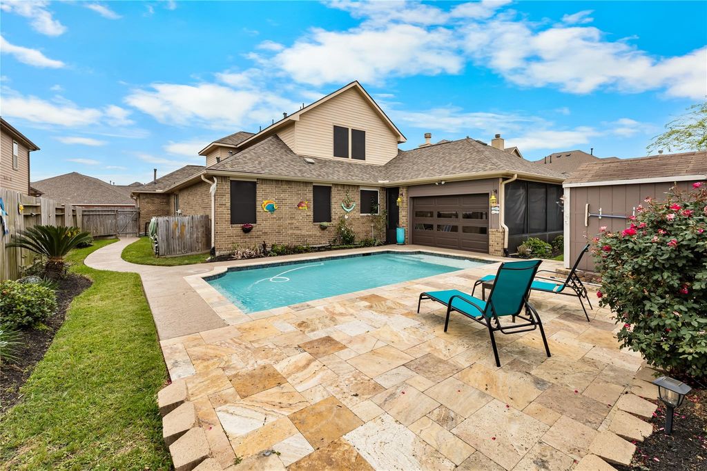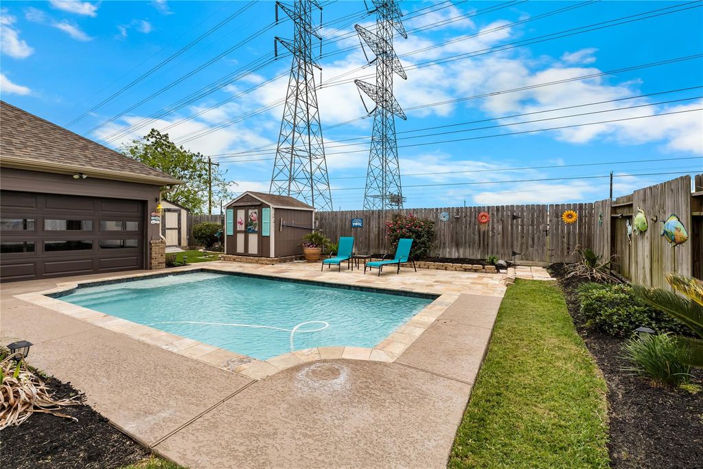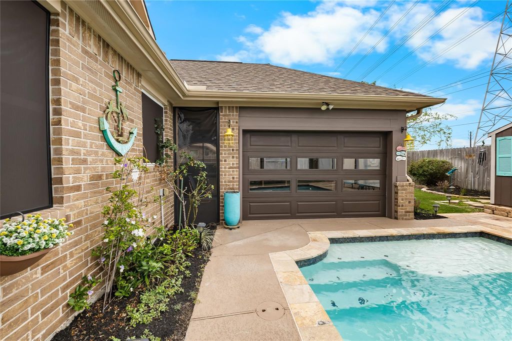 STUNNING! Glistening Pool, Full-House Generator, Exterior Sheltered Patio with BBQ Zone, Three Main-Level Bedrooms, and EVEN MORE! This 4/5-bedroom, 3.5-bathroom gem satisfies every requirement for luxury and security. From the second you pull up, you'll adore this unique and exceptionally practical layout boasting three bedrooms on the first level. The upper floor presents a giant playroom, office (potential 5th bedroom) plus a fourth bedroom and full washroom. Perfect configuration for secluded guests. The stylish kitchen features quartz surfaces, stainless hardware, a pantry closet, and a large curved breakfast ledge that flows straight into the living area. The garden sanctuary highlights a clever motorized garage door that connects to the sparkling pool, producing a fluid indoor-outdoor environment for your relaxation. Simple commute to NASA, fast entry to arterial roads. Experience every perk that Seabrook provides; this is the ultimate spot to settle down.