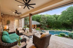 | Tucked beneath a canopy of mature trees in Southlake’s prestigious Kirkwood Hollow, this stunning residence offers a seamless blend of timeless design and thoughtful updates. Backing to a peaceful creek, the home is set on a park-like lot that delivers resort-style living in a serene natural setting. Every detail has been refreshed with warmth and sophistication—from new paint, floors, and fixtures to custom lighting and a brand-new roof installed in 2023. The grand iron and glass entry sets the tone, opening to a private study, formal dining with a butler’s pantry, and a spacious family room with walls of windows framing the picturesque outdoors—ideal for effortless entertaining. The light-filled chef’s kitchen is a true centerpiece, showcasing new quartz countertops, stainless steel appliances including a GE convection double oven and gas cooktop, a wine fridge, planning station, and generous space open to both dining areas. With 5,776 square feet, the home features 5 bedrooms, 5 full and 1 half baths, and an oversized 3-car garage. The first-floor primary suite offers a tranquil retreat, while a separate guest suite and full laundry room are thoughtfully placed on the opposite wing for privacy. Upstairs, enjoy a spacious game room, dedicated media and fitness rooms, and three uniquely styled bedrooms each with en-suite baths. Step outside to a tiered stone patio overlooking a private backyard oasis—perfect for alfresco dining, bocce or basketball, and relaxing by the sparkling pool and spa. Lush landscaping and mature trees frame the view, creating an atmosphere of pure tranquility. Ideally located in top-rated Carroll ISD school district, upscale shopping and fine dining. |