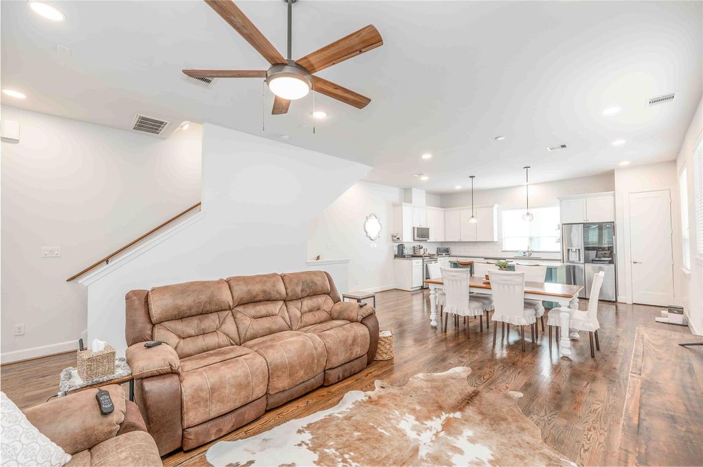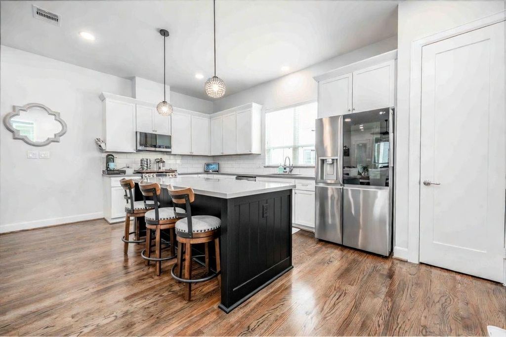 1038 Timbergrove Yards is a rare gem in gated community just minutes from The Heights. A standout feature is the first-floor suite with private entrance, kitchenette, and washer/dryer—ideal for a roommate, in-law suite, or potential Xtra Airbnb income. This 3-bedroom, 3.5-bath home features high ceilings, wood floors throughout, and an open-concept living space filled with natural light. The kitchen offers quartz countertops, SS appliances, a large eat-in island, and abundant storage. The primary suite includes two walk-in closets and a spa-like bath with double vanities, soaking tub, and walk-in shower. Secondary bedrooms each have ensuite baths. Located along a lush courtyard with two dog parks and ample guest parking. Walkable to future mixed-use development The Grove At West Heights! Nearby restaurants, fitness studios, bike trails, and pickleball courts with quick access to 610, I-10, Downtown, the Galleria, and Memorial Park. LINK FOR VIRTUAL TOUR, FEATURE SHEET & HOME WARRANTY