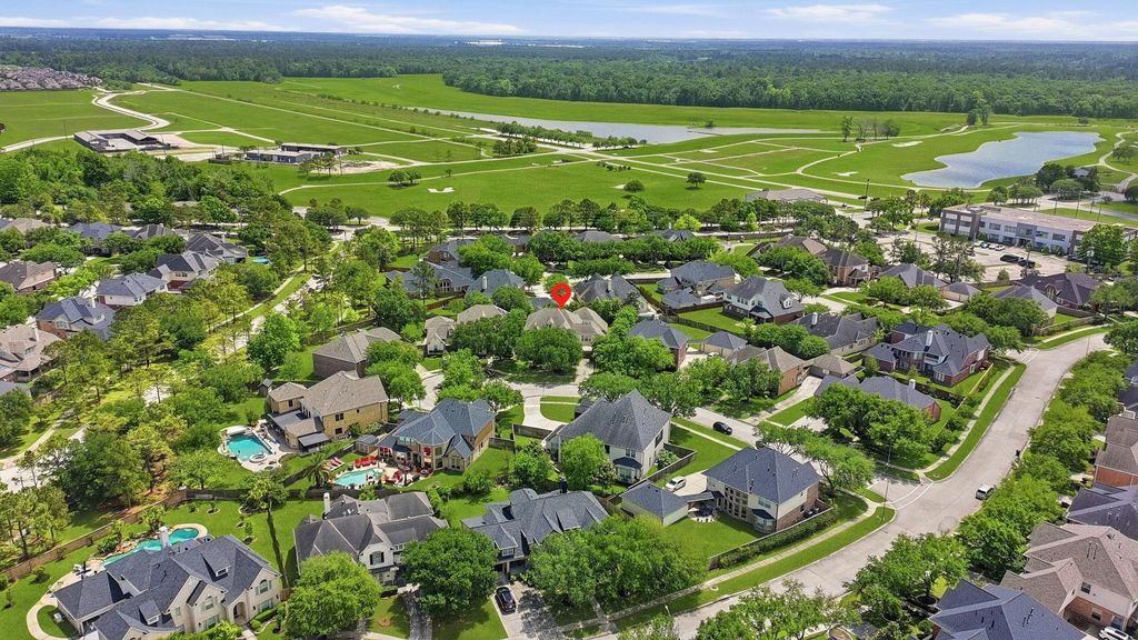 This SHOWSTOPPER offers a true backyard oasis with a sparkling pool & spa, waterfalls, fire pit, outdoor shower & pool bath-perfect for entertaining! Gated entrance with porte-cochere, auto court, 2-car garage & private guest suite. Beautiful stone elevation with professional landscaping. Inside features a gourmet island kitchen with SS appliances, TWO walk-in pantries & abundant storage. Family room boasts soaring 2-story ceilings, hardwood floors & floor-to-ceiling stone fireplace. Luxurious primary suite with sitting area, spa-like bath & huge walk-in closet. Private office downstairs; upstairs includes spacious bedrooms, media & game room. Major upgrades: roof (2021), pool (2021), 2 water heaters (2021), 2 furnaces (2021), downstairs A/C (2025), whole-home water softener & dehumidifier. Enjoy resort-style amenities, parks, pools & trails in Fall Creek, a master-planned golf community by the Golf Club of Houston. Near Beltway 8, Hwy 59 & Bush Airport. MUST SEE!