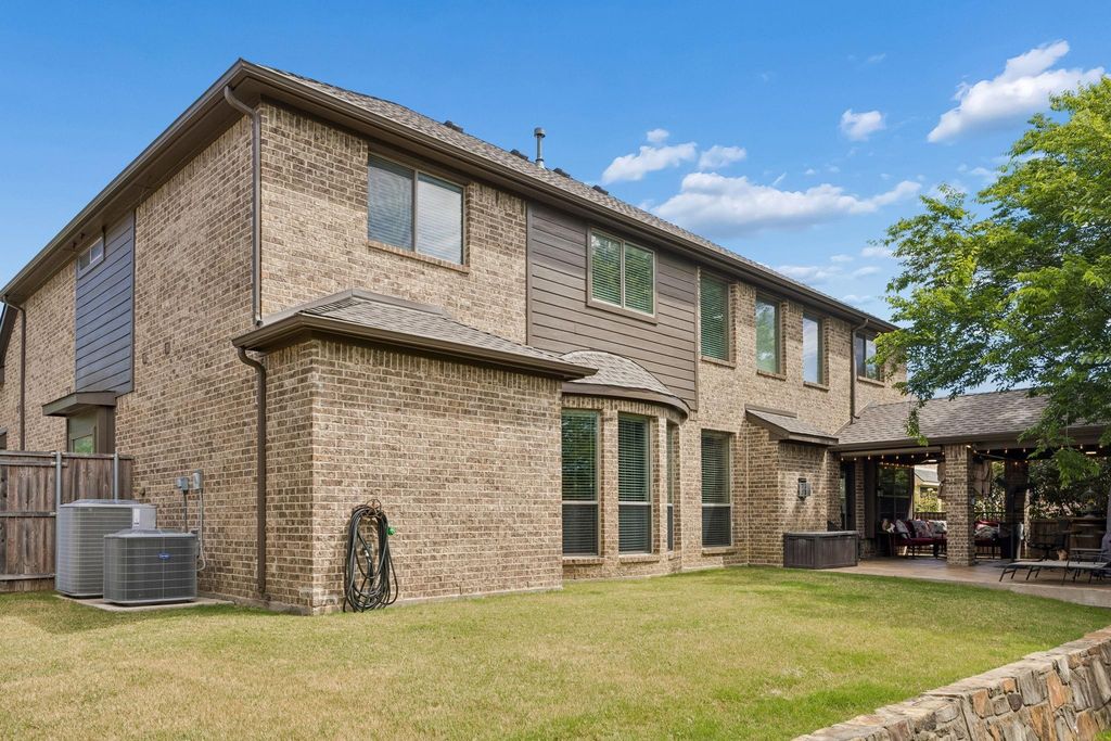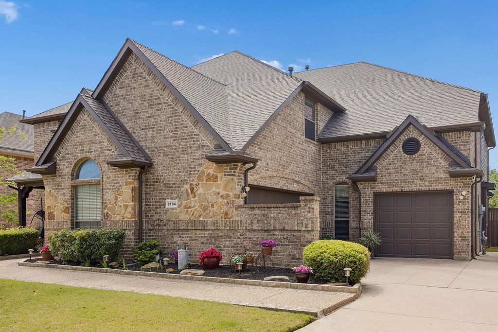 Welcome to 8104 Red River Run - an expansive Birdville ISD home boasting 5 bedrooms, 4 bathrooms, an office, 3-car garage, and an upstairs media room. Hand-scraped hardwood floors welcome you into the winding first floor past the office towards the dining room. The kitchen includes an oversized L-shaped eat-in island with custom tiling, as well as a double-oven, ice maker, walk-in pantry and breakfast area. The living room has massive cathedral ceilings and a stone-hearth fireplace. There are two bedrooms downstairs (including the primary), and three bedrooms upstairs (including an oversized custom bedroom with two closets). The upstairs has plenty of room for lounging either for reading in the gameroom loft, or for watching a movie in the media room. On a nice spring day you can sit outside on the large covered patio that's wired for lighting, electrical, bluetooth sound, and even has a screen to block sun and bugs. With a new roof and carpet in 2026, new exterior paint in 2025, and new HVAC in 2024...this young home has been very thoughtfully maintained and updated.