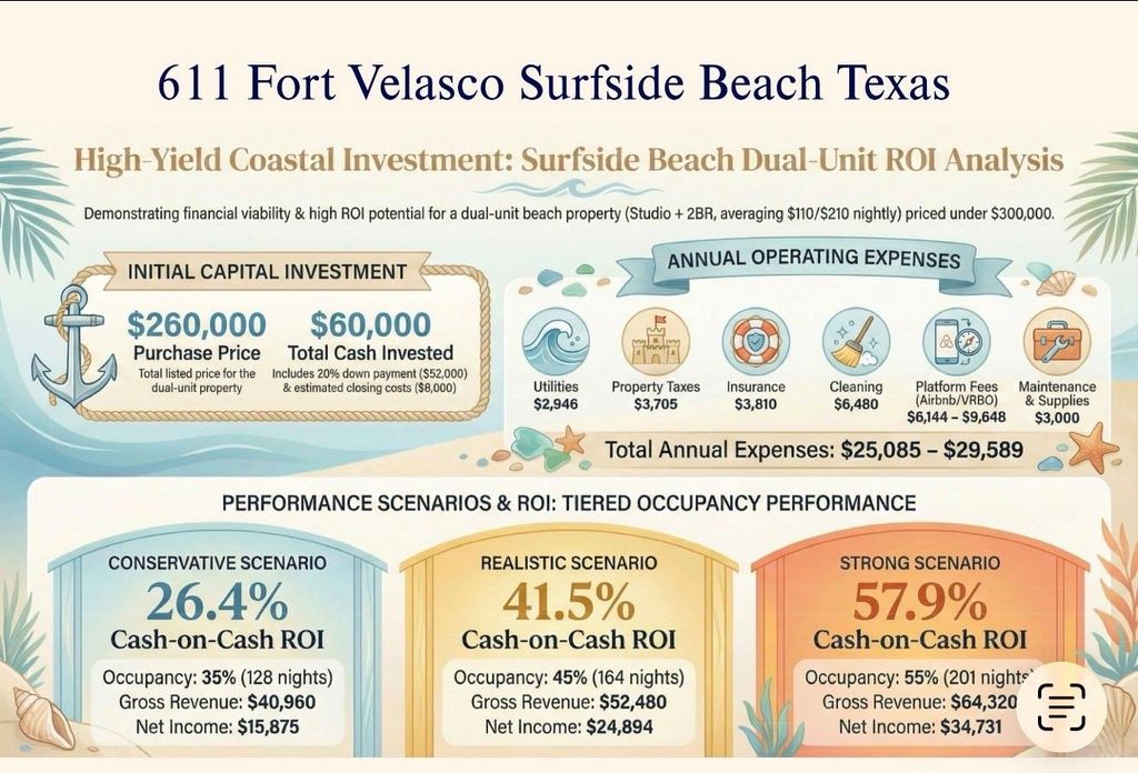 Own a piece of the Texas coast with this rare dual-living beach home just 3 blocks from Surfside Beach. Offering two separate living spaces—a 1-bedroom, 1-bath studio on the ground level and a 2-bedroom, 1-bath home upstairs with beach views—this property is ideal for Airbnb and weekend getaways. Recently remodeled and sold fully furnished, the home features updated flooring, fresh paint, modern fixtures, and a bright coastal interior. The elevated design provides added peace of mind in a coastal environment, while the spacious lot offers room for outdoor entertaining, parking, or future enhancements. Whether you’re looking for an affordable second home near Houston or an income-producing coastal investment, opportunities like this under $300K are rare in Surfside Beach. See the ROI graphic in property photos. Schedule your private showing today.