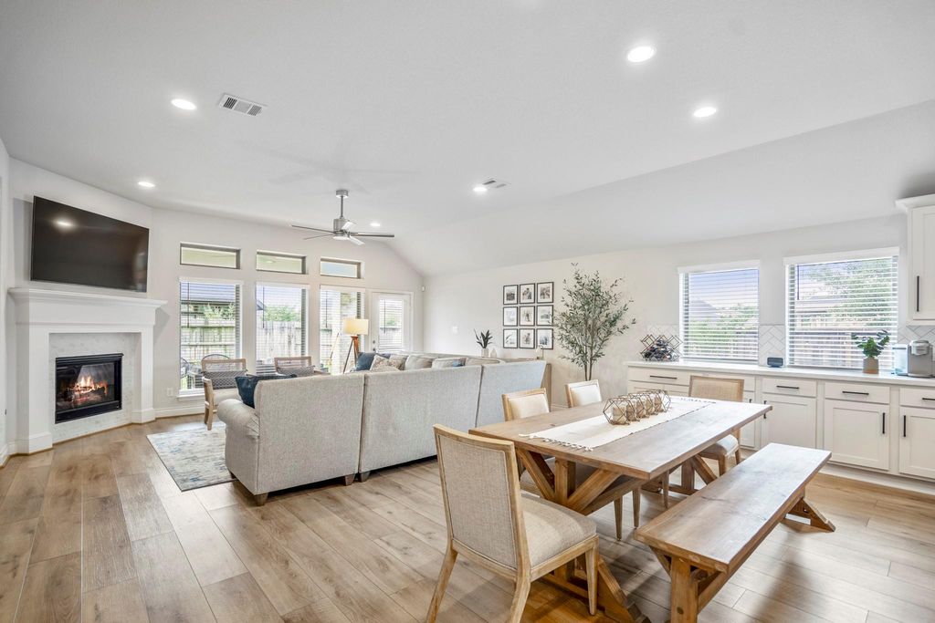 Like-NEW & MOVE-IN READY! This Perry Homes floorplan is the model everyone dreams of! 4 bedrooms + 3 FULL BATHROOMS + STUDY - THIS ONE HAS ALL THE SPACES YOU NEED! Wood-like flooring throughout, light & bright finishes - and on an oversized, corner lot w/ a spacious backyard! Home office has custom built-in w/ shelving, cabinetry & stylish finishes. Entryway is beautiful AND functional w/ private, guest suite (complete with its own bath!) PLUS mud bench as a perfect drop zone upon entry! Kitchen shines w/ herringbone subway tile backsplash, shaker cabinets, serving station w/ additional storage & walk-in pantry. The marble-surround fireplace is the heart of the home and, w/ the open living, makes a beautiful space for entertaining. The primary suite is a retreat w/ dual vanities, soaking tub, and dual, walk-in closets. The oversized back patio and spacious backyard make a outdoor living a breeze. Awarding winning Tomball ISD & all the incredible amenities of Amira make this THE ONE!