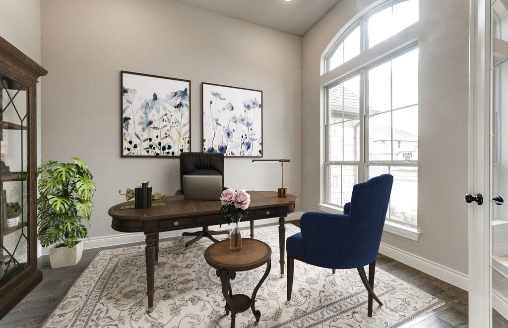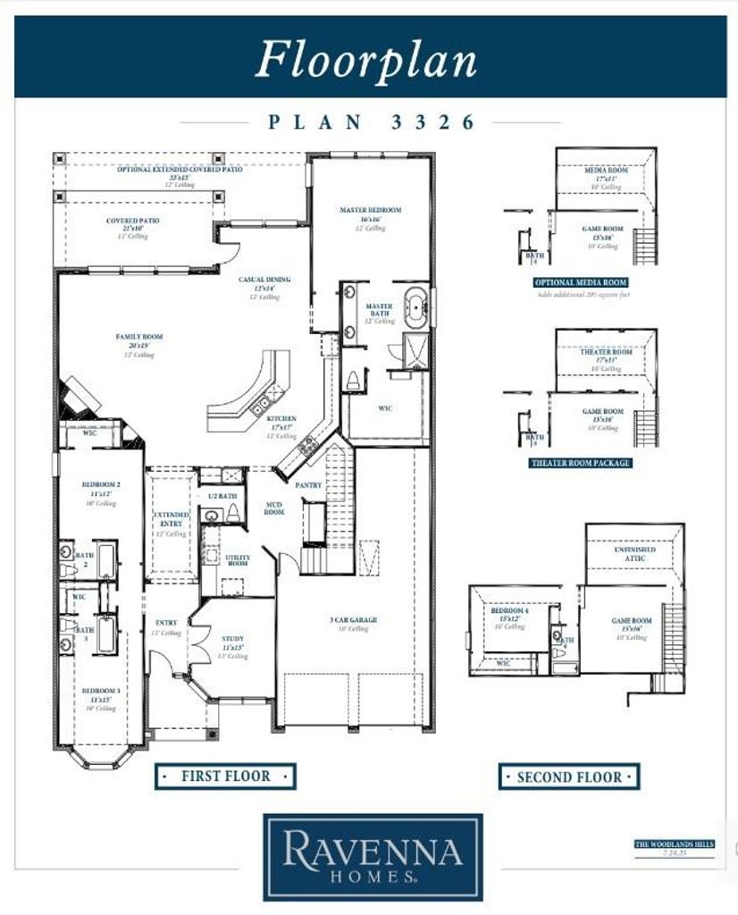 1½-story home features large entry with 12' ceilings that extend past open dining room with 12' ceilings and leads to the family room with 12' ceilings, corner fireplace and full wall of windows. Open kitchen overlooks the large family room and breakfast room, and features 42" raised panel cabinets and an oversized island with high-bar seating. Master bath includes a freestanding tub, separate shower and His and Hers vanities. Upstairs has a game room, theater room, bedroom, and bathroom. Home is complete with an oversized 33' wide patio that overlooks a wooded backyard.