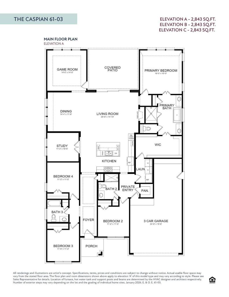 The Caspian floor plan offers 2,843 sq. ft. of space designed for families who love both connection and flexibility. An open-concept kitchen with a large island anchors the home, flowing into the dining area and spacious living room. A game room just off the living space and a private study provide options for entertainment, work, or relaxation. The primary suite is tucked away for privacy, complete with a luxurious bath and oversized walk-in closet. Three secondary bedrooms and two full baths are thoughtfully placed at the front, making room for guests, kids, or multi-generational living. A covered patio, three-car garage, and private entry add convenience and functionality. With its versatile layout and family-friendly design, the Caspian makes everyday living both practical and enjoyable. Measurements are deemed accurate, but if important, please verify. Some photos may be representative and final home may vary from images. Finishes, colors, plan are subject to change.