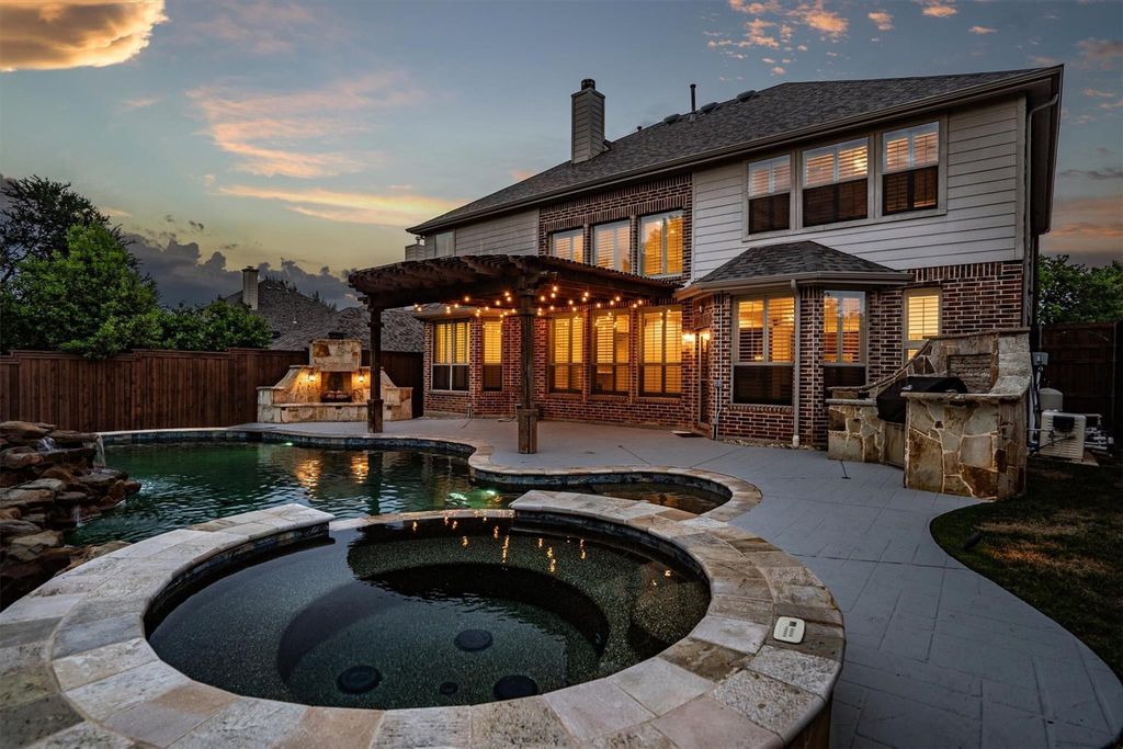 Discover luxury living within this immaculate home nestled in a highly sought-after community. Ideally located, it offers convenient access to serene lakes, picturesque nature trails, expansive parks, and thriving shopping centers and I-35, ensuring you're always close to what matters most. Step into your private backyard oasis, a true retreat equipped with every outdoor luxury imaginable. Highlights include a stunning sparkling Pebble Tech saltwater pool and spa, complemented by a captivating waterfall feature. Enjoy the elegance of stamped concrete underfoot as you entertain in style beneath a covered pergola. The space is further enhanced by a built-in grill and a cozy fireplace, perfect for gatherings both large and small. Inside, the home embraces an open concept living design, complete with floor-to-ceiling windows that offer sweeping views of the magnificent backyard. An elegant office space with French doors creates an ideal work-from-home environment, while the residence boasts refined touches such as gleaming wood floors, plush new carpeting, exquisite granite countertops, and bespoke crown moldings. The addition of plantation shutters provides both privacy and classic charm. Entertainment is effortless in the dedicated media room and spacious upstairs game room. Valuable storage solutions abound, including a floored walk-in attic with a radiant barrier to enhance energy efficiency and a three-car garage offering ample storage space. The main level master retreat is a sanctuary designed for relaxation, featuring a serene sitting area and en-suite bath. Indulge in the custom closet, expertly crafted to accommodate your wardrobe with ease. Don’t miss recent updates - roof, gutters, French drain, hvac, microwave, dishwasher, outdoor grill, water heater, pool heater, media room equipment and more! When you view this home you won't want to leave it!!