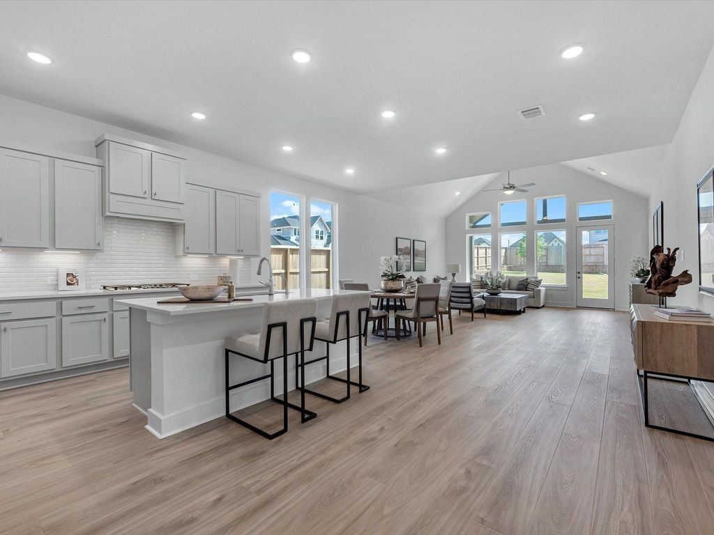 Charming, one-story plan with 4 bedrooms, 3 baths, and 2 car garage. This open layout plan includes 8-foot exterior and interior doors, a gallery-style foyer, a flex room, a central kitchen with open casual dining, a spacious great room with a vaulted ceiling, and a covered outdoor living area. The primary suite features double sinks, a soaking tub, and a large walk-in shower.