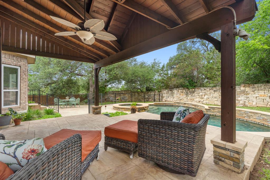 Welcome to this elegant home, perfectly situated on a quiet cul-de-sac and surrounded by beautiful oak trees. The private backyard is a true retreat with a covered patio for family dinners, a swimming pool with a heated spa, and a spacious, park-like side yard shaded by mature oaks. Inside, the welcoming foyer with soaring ceilings sets the tone for a bright and airy home. The adjacent dining room, with double doors opening to the front patio, is perfect for hosting family gatherings and celebrations. The living room features a glass-front gas fireplace and large windows that fill the space with natural light. The main-level primary suite offers a peaceful retreat, complete with warm bamboo flooring, and an ensuite bath featuring a separate shower and a jetted soaking tub. A dedicated office or optional fifth bedroom with a full bathroom on the main level provides flexibility for guests, remote work, or growing families. Fresh interior paint and bright kitchen make everyday living easy with stainless steel appliances, granite counters, a central island for gathering, and a spacious walk-in pantry for storage. Upstairs, a large living area with new carpeting is perfect for a playroom or media space, along with three additional bedrooms and a convenient Jack-and-Jill bathroom setup. Thoughtfully updated, the home features a roof and gutters installed in 2025 and energy-efficient windows added in 2021. Garage with extra storage space and a dedicated EV charger outlet. Located in a highly sought-after neighborhood, scenic trails, community pools in Circle C, playgrounds, and sports courts—perfect for staying active. Zoned to exemplary AISD schools including Clayton Elementary, Gorzycki Middle, and Bowie High School. Southwest Austin convenience, just minutes from the Lady Bird Johnson Wildflower Center, Veloway Park, Violet Crown Trail, Alamo Drafthouse, HEB grocery and so many restaurants.