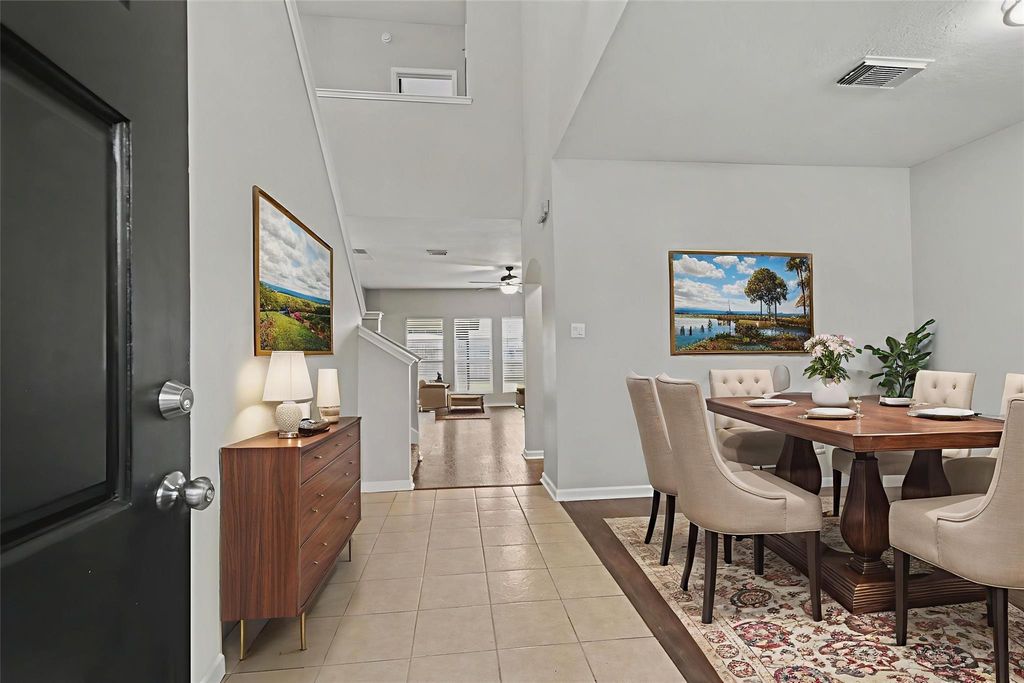 Welcome to this captivating two-story corner home in Baytown! Featuring a spacious kitchen with an island, ample cabinets, and a large pantry. The living room showcases a cozy corner fireplace. The primary bedroom offers vaulted ceilings, a custom accent wall, and a luxurious en-suite bathroom with a soaking tub and separate shower. With a gameroom upstairs, covered patio, and front flex room, this property provides ample space for all your needs. Situated near shopping, dining, and medical facilities, this home is a must-see! Additionally, this home includes a two-car garage and has been virtually staged for potential.