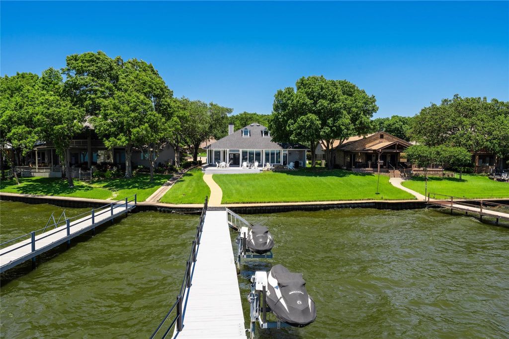 Enchanted Isles --one of Cedar Creek Lake's most sought-after and scenic waterfront communities. Beautifully updated and move-in ready, this home is designed for effortless lake living and entertaining. The open-concept living and dining area features soaring ceilings, wood look tile floors, and a wall of floor to ceiling windows that capture breathtaking open water views. The well-appointed kitchen is a cook's dream, offering abundant cabinetry, granite countertops, a stylish tile backsplash, and generous workspace for preparing and serving. The spacious primary suite provides a private retreat with serene water views and a luxurious bath complete with a soaking tub and separate walk-in shower. Step outside to enjoy the ultimate lakeside setting-featuring a covered porch, expansive decking, a stone fire pit area, and refreshing southern breezes, all overlooking wide open water. The boathouse is equally impressive, with a covered seating area, a large sundeck, space for an oversized boat, and lifts for two personal watercraft--everything you need to fully embrace the lake lifestyle.