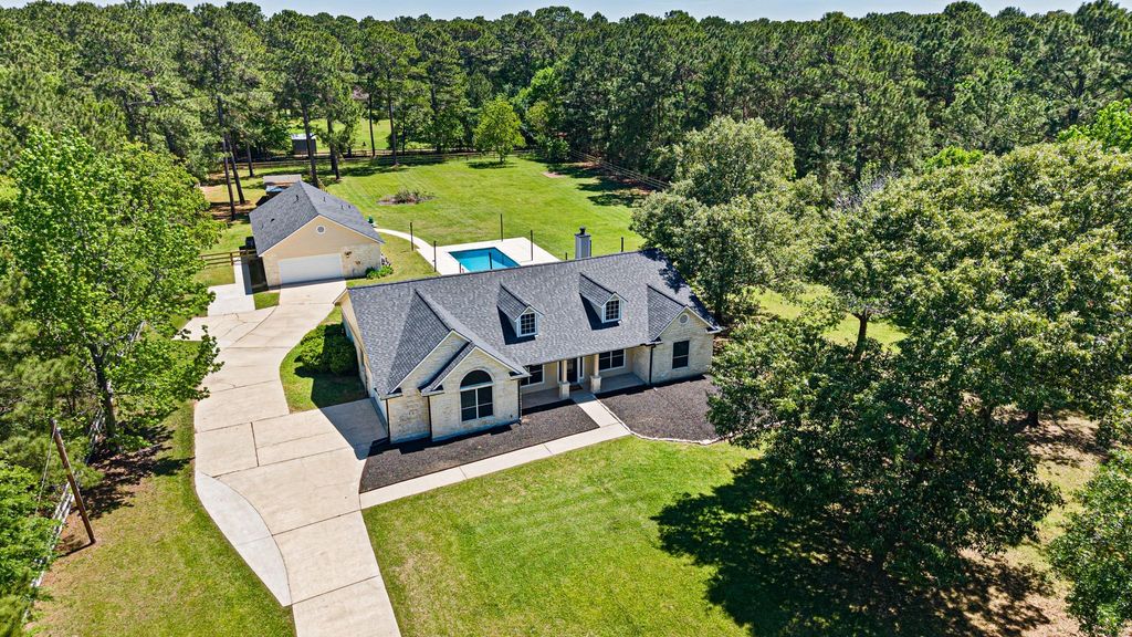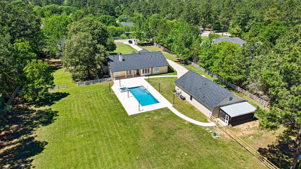 Beautiful one story smart home in peaceful Indigo Lake Estates. Impressive two acre lot with brand new shower remodel and new fence enclosing the propety with controlled entry. The main home (2273 sq. ft) has a total of 4 bedrooms, 2.5 bathrooms, updated kitchen, open living space with a stone fireplace and plenty of light from the spacious backyard. The guest house (876 sq. ft) is a 2 bedroom, 1 bath (1/2 bath/pool bath in garage) beautifully updated and maintained. New roof in 2025, A/C 2021 and 2023 and pool 2022. Enjoy the peacefulness of the surrounding trees and the deer roaming free throughout the day. This is a premier acreage community offering a 162 acre private lake where you can enjoy fishing, horse trails, a community center, fields for soccer and baseball and a beach area/park. Horses and chickens allowed. Low taxes.