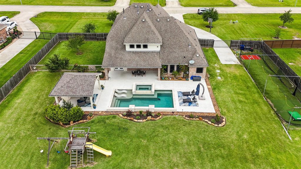 Nestled on over an acre, this exceptional home blends refined design with elevated everyday living. Featuring 4 bedrooms and 3.5 bathrooms, the thoughtfully curated layout includes a formal dining room, private study, and an upstairs game room—perfect for both entertaining and retreat. The open-concept living space is anchored by a chef-inspired kitchen with stainless steel appliances and seamless flow throughout. The primary bedroom is a true sanctuary, complete with a spa-like en suite and an expansive walk-in closet. Step outside to your fully fenced backyard featuring an inground pool, hot tub, and a covered outdoor kitchen designed for unforgettable gatherings. Sophistication and luxury converge—schedule your private showing today!
