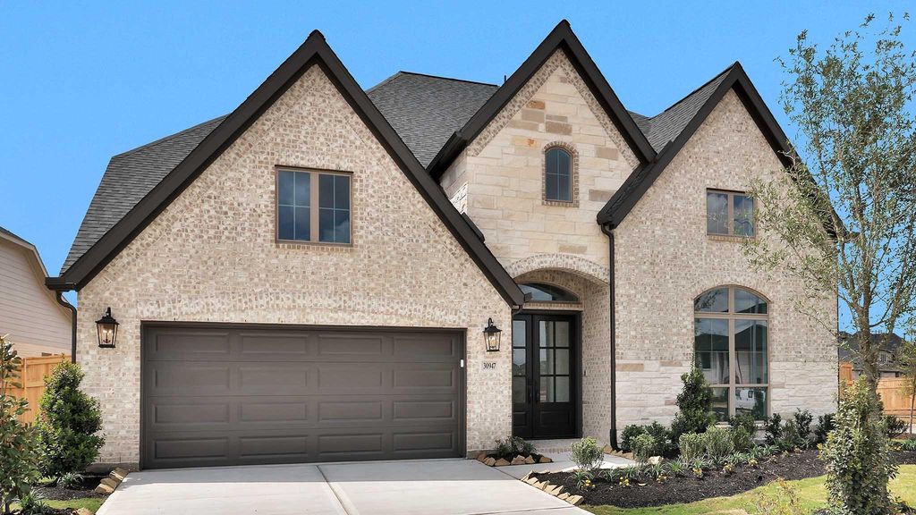 READY FOR MOVE-IN! Home office with French doors set at entry with 20-foot ceiling. Formal dining room opens to rotunda with curved staircase. Two-story family room with 18-foot ceiling and wall of windows and a wood mantel fireplace opens to kitchen and morning area. Kitchen hosts generous island with built-in seating space and a 5-burner gas cooktop. Primary suite with a wall of windows. Primary bath includes dual vanity, a freestanding tub, separate glass-enclosed shower and large walk-in closet with access to utility room. First-floor guest suite. A game room, media room and two secondary bedrooms are upstairs. Covered backyard patio. Mud room off three-car garage.