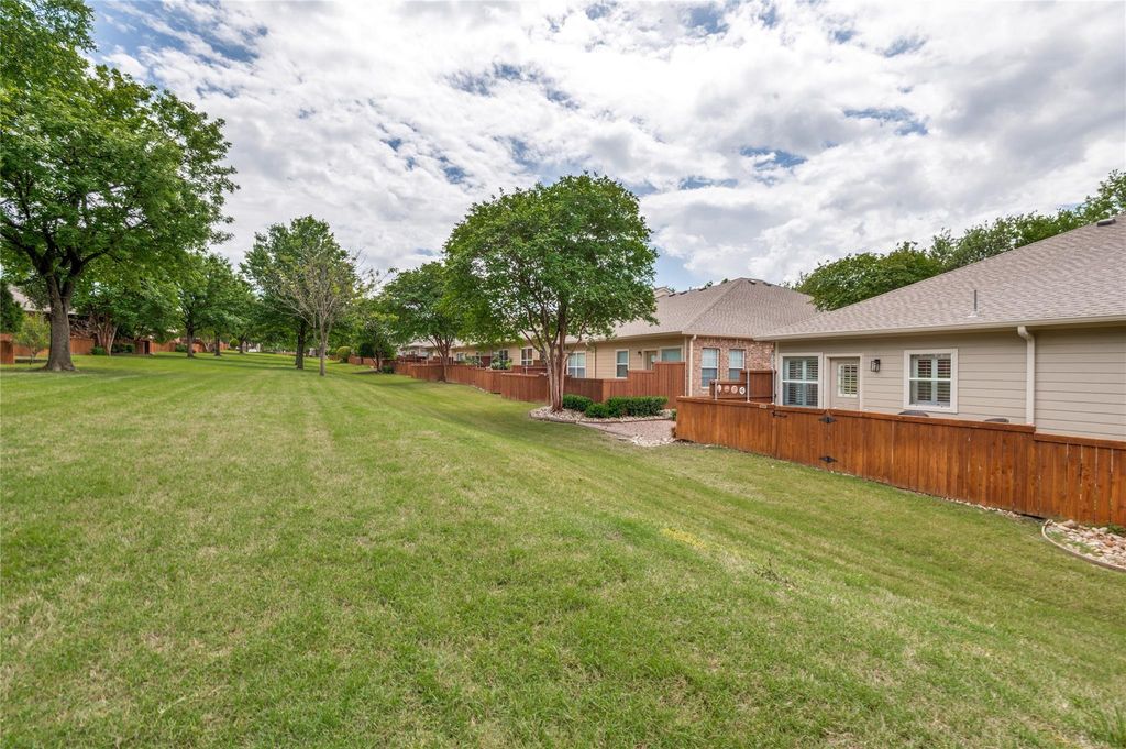 Situated on a rolling greenbelt and sensationally remodeled, this one-story home lives like a perfectly tailored suit—exquisite quality-nothing missing. With two bedrooms, a dedicated study, and a thoughtfully designed layout, every inch serves a purpose. Sunlight pours through plantation shutters, casting a soft glow across custom moldings, elevated lighting, and carefully curated materials that feel both current and timeless. This isn’t a house that was updated. It was reimagined. Adorned with quartzite countertops, the kitchen does what great kitchens do. This hub balances durability with undeniable beauty and invites fellowship. The split-bedroom layout isn’t just practical—it’s luxurious. Each bedroom rests in its own corner of the home, creating natural separation and quiet. The primary suite is like a true retreat—completely private, serene, enjoys dual vanities and a large walk-in closet. Soft lighting and easy surroundings make it enticing to stay home. The property opens to a manicured garden and private patio—your own pocket of tranquility without the burden of constant maintenance. The home lives like a single-family home yet offers the convenience of condominium ownership. Owners enjoy true lock-and-leave freedom, whereby the HOA handles exterior maintenance and the community pool. The refrigerator and washer-dryer come with the home. Having the proximity to Legacy West, Ridgeview Ranch golf course, Sam Rayburn tollway and all of the sensational shops and restaurants, this opportunity represents the kind of lifestyle that says yes to travel, spontaneity, and ease—without sacrificing beauty at home.