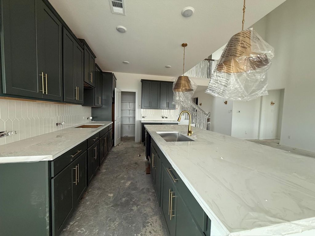 Experience modern living in the Cypress plan with two thoughtfully designed stories. A grand entry opens to a spacious family room with soaring ceilings and views to the game room, perfect for entertaining. The gourmet kitchen offers ample prep space and a large walk-in pantry. The primary suite features a tray ceiling and double door entry to a spa-like bath with dual vanities. First floor guest bedroom and study add flexibility. Finished in the Luxe Collection with green cabinetry, white tile backsplash, and modern textures for a light, relaxed feel. Located in the Brookewater community with a resort-style pool, lazy river, green space, pavilion, walking trails and more.