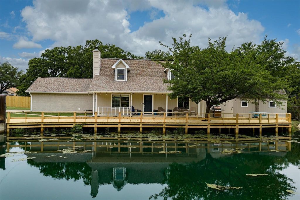 Unique, distinctive waterfront home tucked on a .26 acre lot in Lake Dallas! This hidden gem is ready for a new owner who loves waterfront living and appreciates something truly character filled. Unlike neighboring homes that face the street, this one was intentionally designed to turn toward the water, creating a stunning first impression and a lifestyle centered around the view. Follow the new professionally built long boardwalk approach with guardrails to a sprawling deck overlooking the water, then relax on the expansive covered front porch that spans the width of the home and captures peaceful nature views beyond. Inside, you’ll find rich deep wood-look laminate flooring throughout most of the home, including the staircase and upstairs, with tile in both baths. The grand living area is anchored by an attractive brick wood-burning fireplace and flows seamlessly into the dining area and kitchen, making it ideal for everyday living or entertaining. The kitchen features quartz countertops, stainless steel appliances, and newly refinished cabinetry. The dining area easily accommodates casual meals or formal. The generously sized primary suite is located on the main level and includes an adjoining sitting area perfect for a nursery, office, reading nook, or workout space. The bath offers private access, an oversized shower with subway tile surround, and pebble-look flooring. Upstairs, you’ll find two additional bedrooms and a full bath with a subway tile shower surround and tile flooring. Step outside to the expansive backyard and imagine the possibilities: outdoor kitchen, pickleball court, pool, raised garden beds, play space, or your own private retreat. There’s even more with the 20x16 workshop featuring full electric, ideal as a man cave, she shed, separate office, game room, studio, or hobby space. A rare opportunity in a close-knit neighborhood with no HOA. Relaxed waterfront living with personality, charm, and endless potential awaits!