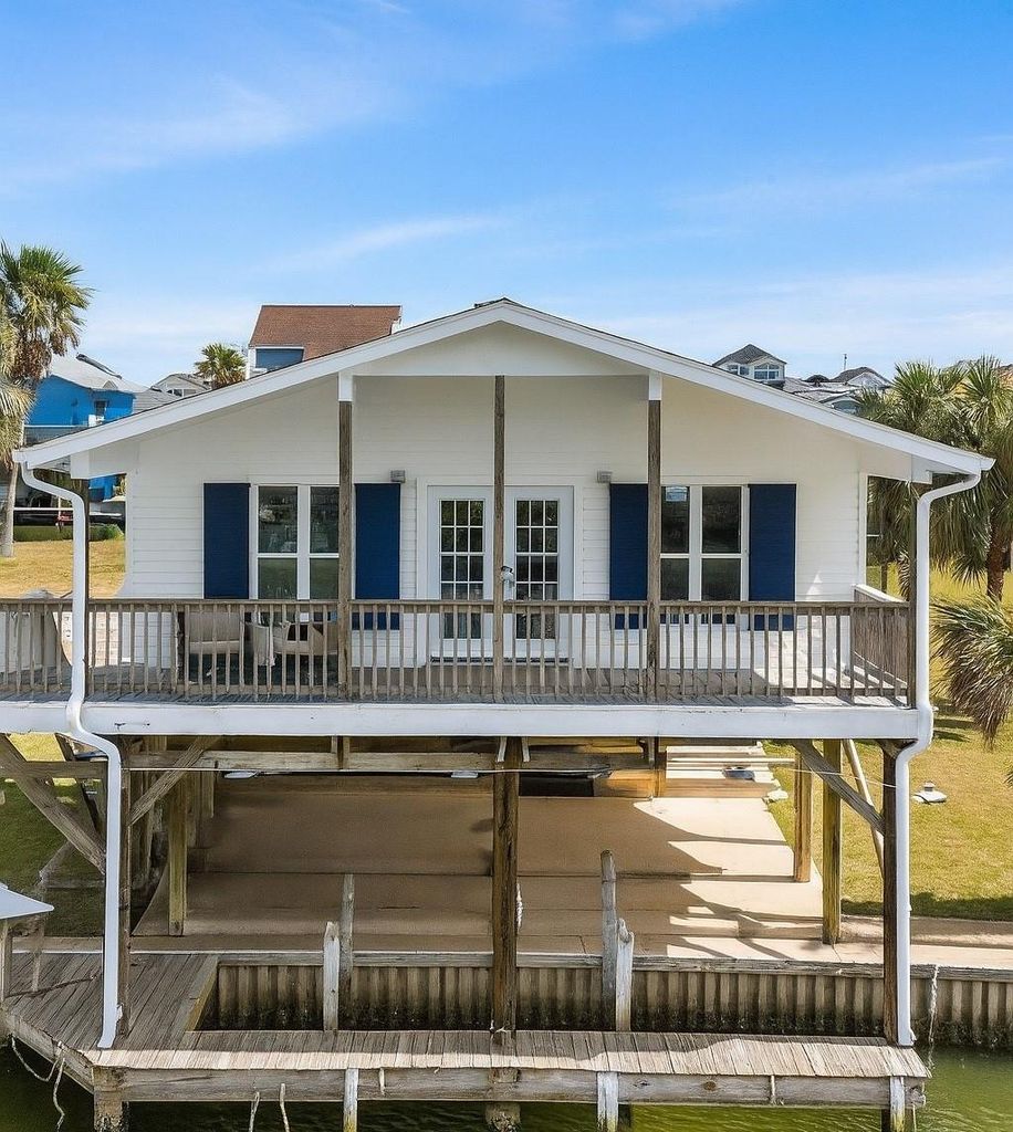 WATERFRONT GEM with NEW HVAC! Make this adorable cottage your very own! This charming 2-bed, 1-bath canal home offers bright, open-concept living with vaulted ceilings and wood beam accents. The spacious kitchen flows into a sunny living area—perfect for gatherings! Relax on the covered deck with tranquil canal views or entertain downstairs in the shaded lounge. Fish from your private dock or launch your boat with direct access to West Galveston Bay. Bedrooms are tucked away for privacy and share a generous bath. Just a quick golf cart ride to the beach and close to community amenities: boat launch, pool, fishing pier & frisbee golf. A standout coastal retreat in a sea of listings! Scroll through the photos to see fun, AI-generated ideas for fresh and colorful exterior paint options—imagine the possibilities!