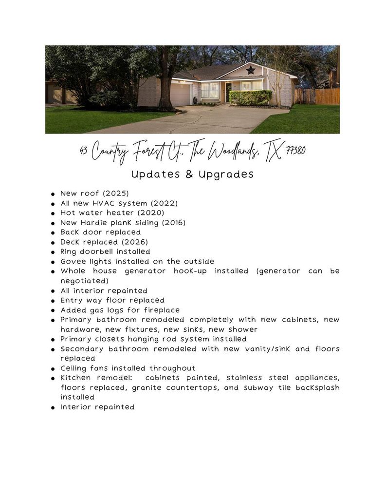 LOCATION, LOCATION, LOCATION! Minutes from IH-45, Hardy Toll Rd., Grand Parkway, ExxonMobil, and The Woodlands Mall & Market Street. This updated 4-bed, 2-bath home features a functional floor plan w/ a versatile formal dining room ideal for a study or flex space. Spacious family room w/ soaring ceilings & gas-log fireplace. UPDATED KITCHEN w/ granite countertops, subway tile backsplash, stainless steel appliances, gas range & updated flooring, opening to a bright breakfast area. PRIMARY BATH RENOVATED w/ new shower, cabinets, countertops & custom closet system w/ 2 separate primary closets. SECONDARY BATH UPDATED w/ new sink, cabinet, mirror & flooring. MAJOR UPDATES include NEW ROOF, HVAC, HARDIE PLANK SIDING, WATER HEATER, replaced back door, entry flooring, fresh mulch, exterior Govee lights, Ring doorbell, GENERATOR HOOKUP & updated paint. Spacious backyard w/ NEW DECK! Zoned to acclaimed Conroe ISD schools! Enjoy 220+ miles of hike/bike trails to parks, schools & shopping.