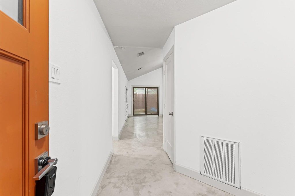 29 South High Oaks Circle is a contemporary modern 3-bedroom, 2-bath home for sale in The Village of Grogan’s Mill. Step into the foyer, with the living room straight ahead and the dining area and kitchen to the right. The fully remodeled kitchen features updated stainless steel appliances and a gas range. It connects to the laundry room with washer and dryer connections, which leads to the attached two-car garage. Polished concrete floors run throughout the home, and the roof was replaced approximately five years ago. The 17' x 20' living room offers a wood/gas fireplace and access to the backyard deck. A hallway off the living room leads to the secondary bedrooms, primary bedroom, and both bathrooms. Both bathrooms have been recently remodeled. The primary bedroom overlooks the backyard, and the primary bath includes dual sinks, two closets, and a walk-in shower. The large, fully-fenced backyard features six trees.