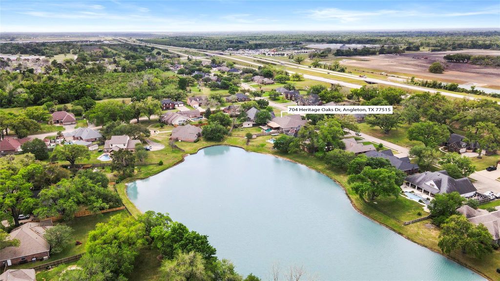 Welcome to 704 Heritage Oaks Drive — a breathtaking lakefront retreat where luxury meets tranquility. Set on a half-acre beneath mature trees, this showpiece home offers stunning water views and a resort-style backyard featuring a hand-carved rock waterfall saltwater pool, spa, and beautifully lit pergola and palapa spaces perfect for entertaining. Inside, soaring ceilings and elegant finishes elevate the living experience. The chef’s kitchen with granite countertops opens to spacious living areas, while the serene primary suite features a spa-like rain shower and sitting area. A private guest suite with full kitchen and bath is ideal for multigenerational living. Upstairs media room with full bath adds flexibility. Complete with a 3-car garage, workshop, storage building with electricity, storm-impact windows, and a new roof (2024)—all just minutes from Hwy 288.