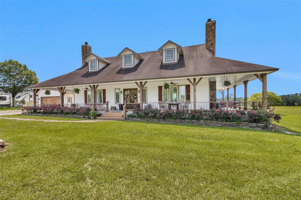 Beautiful custom 3-bedroom 2.5 bath home with 2 car garage, a 60x40 shop on a slab with two roll up doors and a 24ft overhang sitting on 102+/- acres on Highway 105 East in Conroe, TX. Greeted by an electric gate and a winding driveway leading to the house, a wraparound concrete porch to enjoy views of the property. Entering the house, the living area is open with large beams showcasing the high ceilings and a large stone fireplace. Light and bright kitchen with granite countertops, large island, double ovens, gas cooktop and a walk-in pantry. The master bedroom has a gas log fireplace, two walk-in closets, one with built-in vanity. A claw foot tub and walk-in shower, double sinks finish out the master bath. Large 30x10 laundry room connected to master bath. Upstairs are two large bedrooms, game room and a full bath with walk-in shower. Outside the land is bordered on a couple sides by Caney Creek, property has been used to deer hunt, cut hay, run cows, lots of options!!