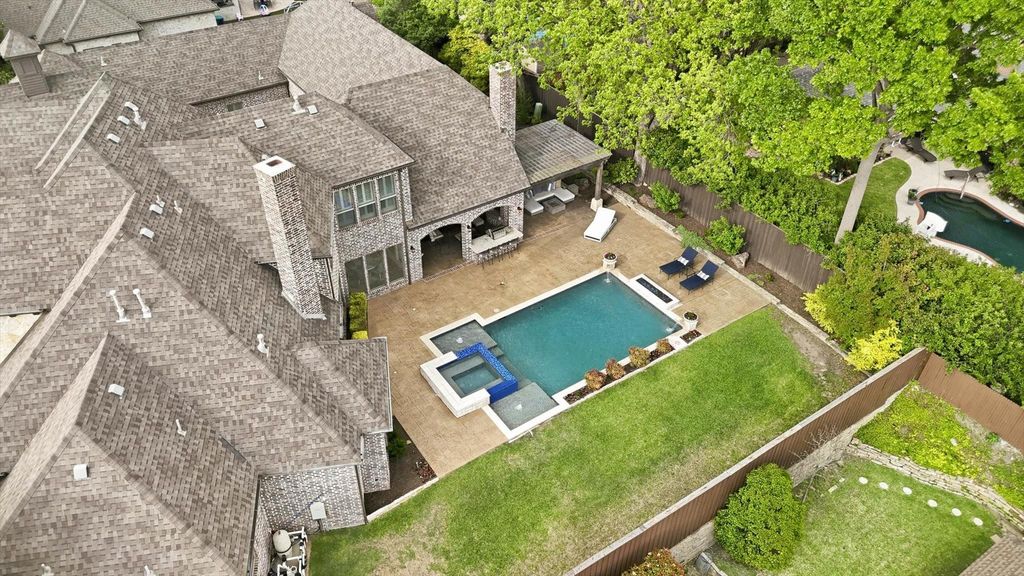 Luxury estate on an oversized lot with exceptional privacy featuring a 4 bed, 4.1 bath main house plus a fully equipped attached 2 bed, 2 bath guest house, ideal for multigenerational living. Stepping through the iron double doors you’re welcomed by beautiful white oak floors and a sweeping staircase. A formal dining room sits to the left and a study to the right with French doors and custom built-ins. Open-concept living area with a stone-faced gas log fireplace, expansive picture windows overlooking the backyard paradise, and a bonus wet bar with wine fridge and ice maker. The kitchen has been extensively updated with white cabinetry, honed Taj Mahal quartzite counters, stainless appliances including double ovens and a warming drawer, gas cooktop, built-in fridge, custom apron sink, and a walk-in pantry. Designer lighting and plantation shutters continue throughout the home. The primary suite is privately positioned on the right side of the home with backyard views and direct outdoor access, featuring dual sinks, a tub, walk-in shower, and spacious walk-in closet. The first floor also includes a guest bedroom with ensuite bath, an additional half bath, and a laundry room with ample cabinetry and a sink. Upstairs offers a game and media room with a wet bar, along with two additional bedrooms, each with ensuite baths. A gated motor court leads to the three-car garage and provides access to the attached guest house with private entrance, offering a living room with sliding doors to its own patio, dining area, full kitchen with pantry, laundry, and two bedrooms, each with ensuite baths. The resort-style backyard features a stunning pool and spa, a covered patio with a double-sided fireplace, built-in grill and refrigerator, an additional pergola that creates a secondary seating area, fire pit, and outdoor shower, all surrounded by stamped concrete decking that extends the living space outdoors.