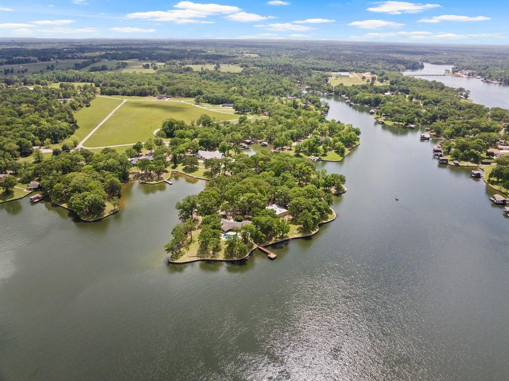 Completely reimagined inside and out, this extraordinary legacy property invites you to create generations of memories in one of Lake Bob Sandlin’s most breathtaking settings. Perched on approximately 2.5 acres at the tip of the peninsula, this rare offering boasts over 1,500 feet of shoreline, delivering unmatched panoramic water views and an unparalleled sense of privacy. With water visible from every window and multiple living and dining areas both inside and out, this nearly 4000 square foot home provides ample space for entertaining the masses. Outside, your private oasis awaits. Lounge in the shade or soak up the sun all on the expansive flagstone patio that draws you out of the house and wraps the pool connecting the two seamlessly. At the water, the private dock, and access to a private boat ramp provide additional lakeside amenities. Step through the foyer and into the formal living and dining where a statement fireplace creates a cozy intimate setting, while floor to ceiling windows flood the rooms with warm sunlight and allow nature to permeate the home. The kitchen features cabinetry galore, sprawling granite counters with bar seating, plus a breakfast nook that looks over the adjoining den and or dining area out to the water. The oversized primary suite includes its own fireplace to sit by, and an ensuite bath equally as spacious with a soaking tub, tile shower, dual vanities, and custom walk-in closet. Following suit are 2 well appointed guest rooms each with private bathrooms, and a bonus room with a full wet bar and endless possibilities. The property also includes a 2,400 square foot shop with electricity and roll-up doors, perfect for added covered parking, boat storage, or hobbies. Immerse yourself in lake life today!